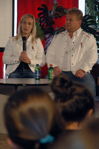 A hét péntekje még egy nagy meglepetéssel is szolgált. A reggeli papírgyűjtés után – amelyen a diákönkormányzat működése anyagi hátterének biztosítása céljából ismét szép mennyiség gyűlt össze – négy hagyományos tanórát követően az egykori Bárdos-diák, mára olimpiai bronzérmes cselgáncsozó, Csernoviczki Éva és azóta megyei Príma-díjjal jutalmazott édesapja, Csernoviczki Csaba volt a vendégünk, akik beszámolót tartottak Éva karrierjének állomásairól és a londoni élményekről.