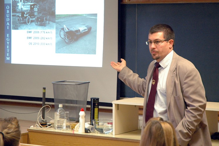 Az előadást Farkasné Takács Ágnes vezető HR-specialista nyitotta meg. Ezután Győri-Varga László termékmérnök és Boros Attila belsőtréning-specialista előadása következett. A szivattyú működésével ismerkedtünk, és felhasználásáról hallhattunk, azt is megtudtuk, hogy a Grundfos exportálja a szivattyúkat az Arab Emirátusokba, és a dubai Pálma-szigetek is így jöhettek létre. Ezen kívül a villanymotor előállításáról és kivitelezéséről is tanulhattunk. Ezután Kuti János, az Óbudai Egyetem igazgatója ismertette velünk a mérnöki szakma előnyeit. Hallhattunk az egyetemi életről, érdekes versenyekről, köztük a tésztahídról, melynek rekordját 2001 óta a magyarok tartják.