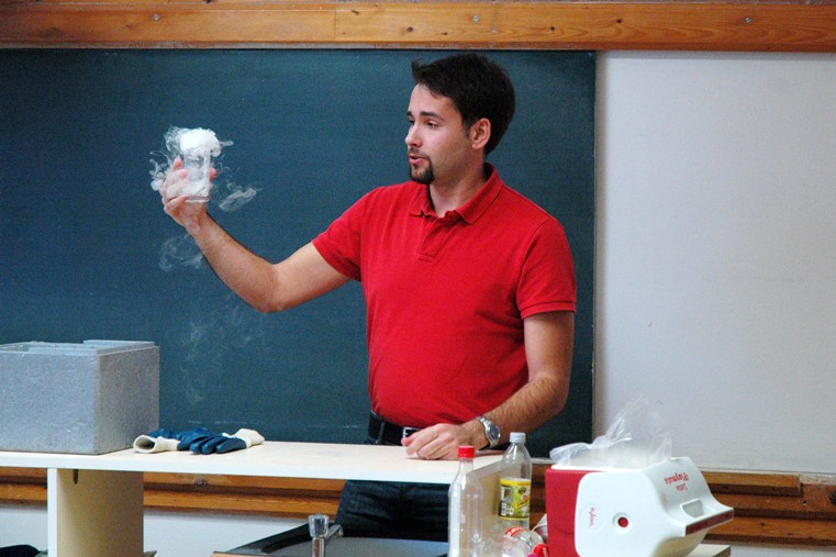Ezt követte Fazekas Bence projektmenedzser, aki a Csodák Palotája egyik előadója is, de most nem ennek képviseletében volt az iskolánkban, hanem szárazjéggel mutatott be különböző kísérleteket, véleményünk szerint a diákok ezt élvezték a legjobban, mert ez volt a legérdekesebb, leglátványosabb.