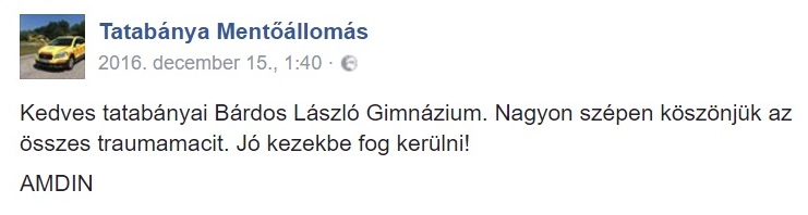 A Bárdos diákjai segítettek a helyi mentőszolgálatnak azzal, hogy macit gyűjtöttek azoknak a kisgyermekeknek, akinek szülője, nagyszülője sérült meg, vagy esetleg ő maga. Nagyjából kétszáz traumamaci gyűlt össze október 28-ra. Nagyon köszönjük azoknak, akik segítették a terápiás macigyűjtést.