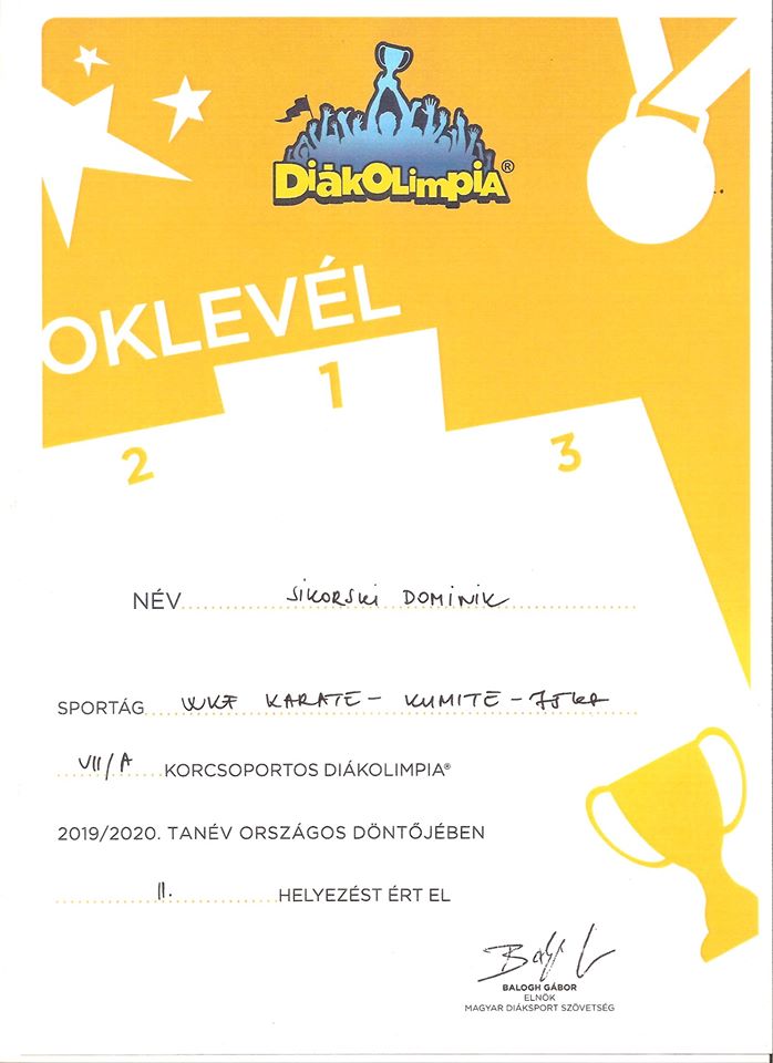 Sikorski Dominik a Diákolimpia országos döntőjében 2. helyezést ért el karate sportágban