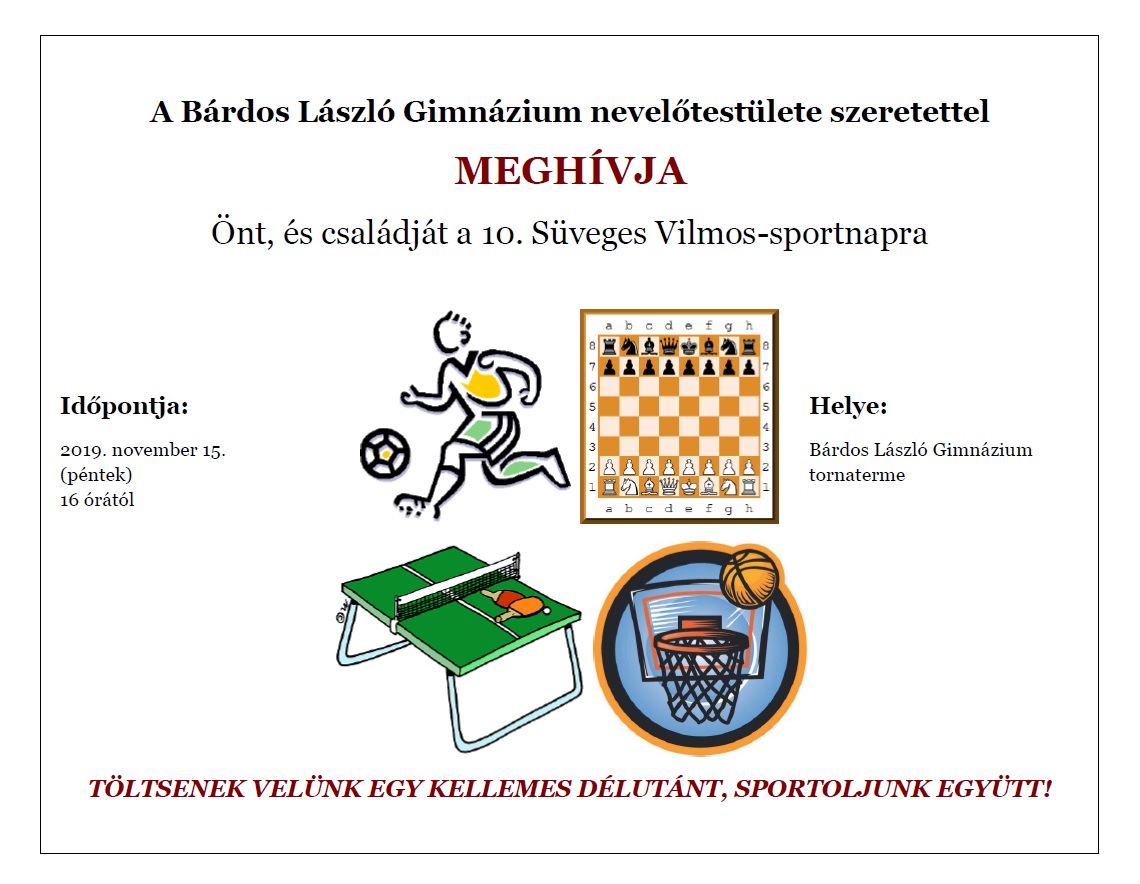 Süveges Vilmos Sportnapot rendeztünk iskolánkban. A lelkes szülők, gyerekek és tanárok kosárlabdában, fociban illetve sakkban és asztaliteniszben mérték össze tudásukat.