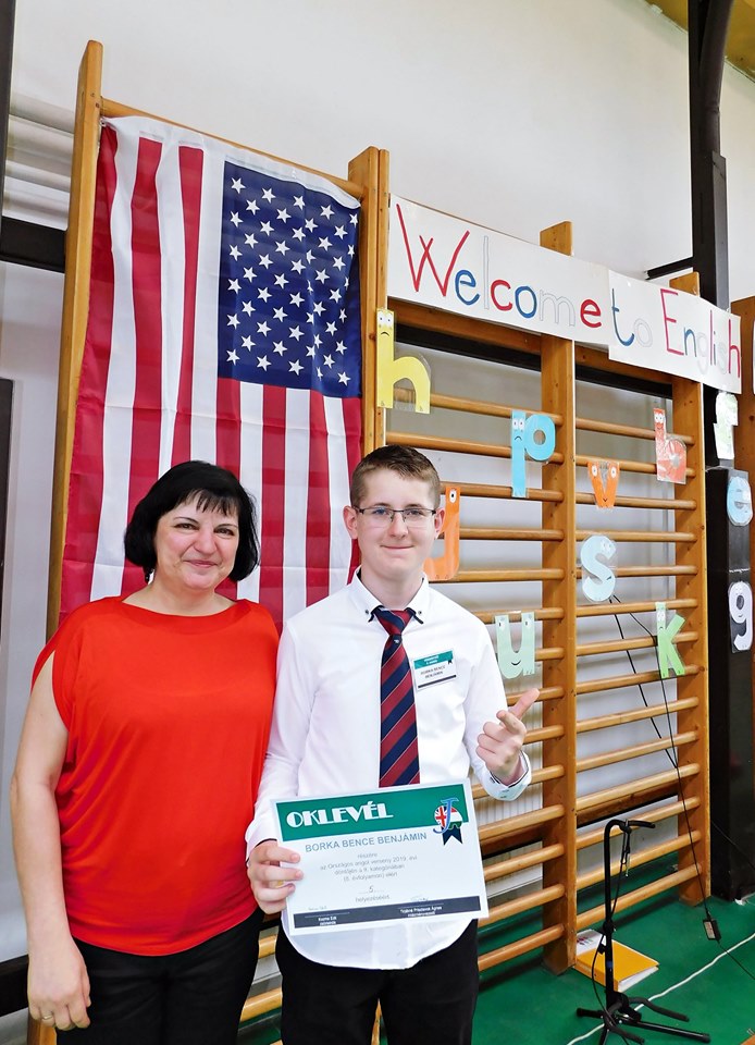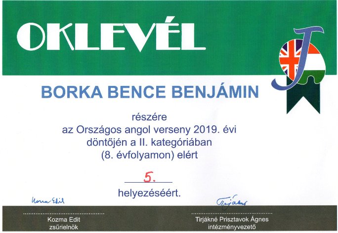 Borka Bence 8.a osztályos tanulónk az Országos angol verseny 2019. évi döntőjében (II. kategória, 8. évfolyam) 5. helyen végzett.