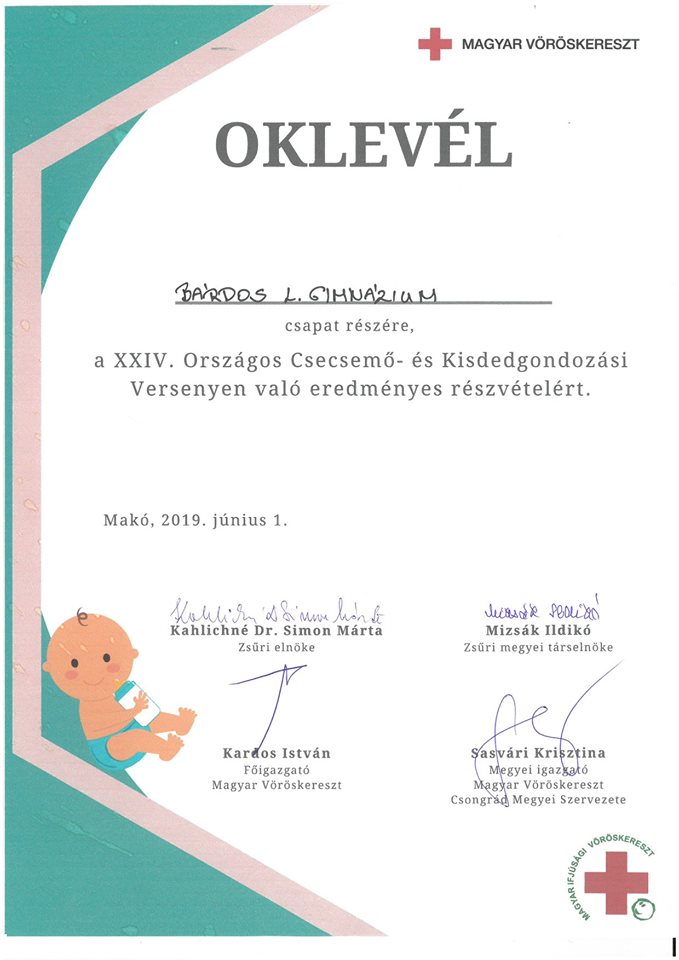Gratulálunk a Szántó Kata, Tóth Anna Luca és Zulik Laura alkotta csapatunknak, akik a Csecsemő- és Kisdedgondozási Versenyen megyei első helyezést értek el, és az országos döntőben is eredményesen szerepeltek. Köszönjük Budincsevich Márta iskolavédőnő munkáját, aki a csapatot felkészítette a versenyre. Gratulálunk neki is a szép eredményhez!