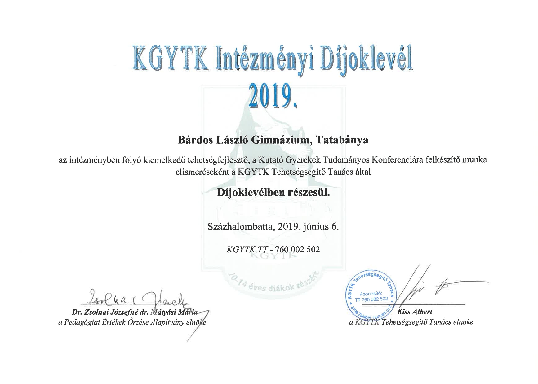 Andirkó Marcell 7. a – Kutató Gyerekek Tudományos Konferenciája országos 5. hely – Jónásné Lukovics Katalin
