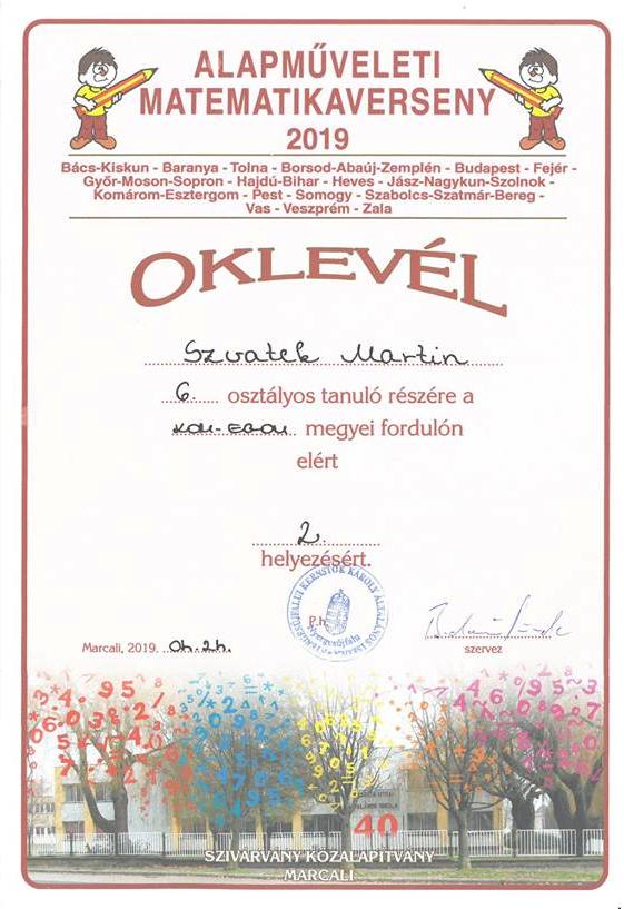 Gratulálunk Szvatek Martin 6. a osztályos tanulónknak, aki az Alapműveleti Matematikaversenyen megyei 2. helyezést ért el.