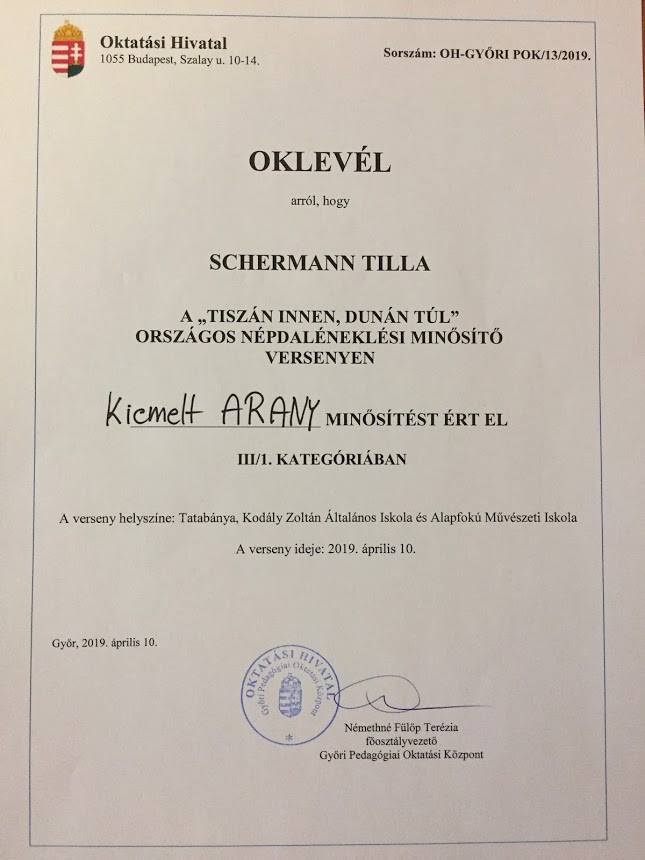 A Tiszán innen, Dunán túl népdaléneklési minősítő verseny megyei fordulóján Schermann Tilla 11.b osztályos tanulónk kiemelt arany minősítést kapott és az országos döntőbe jutott!