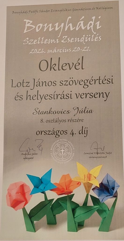 Hatalmas siker! Stankovics Júlia (8. a) 4. helyezést ért el a Lotz János szövegértési és helyesírási verseny országos döntőjében!