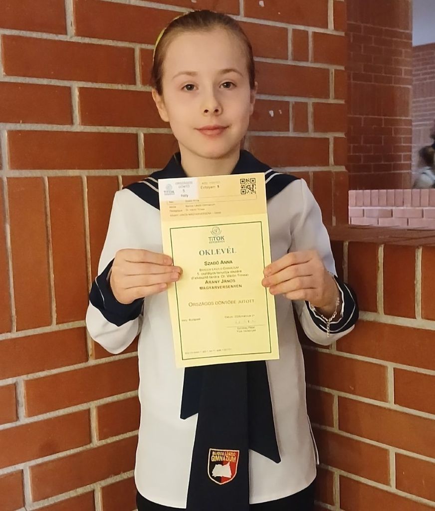Egy újabb fantasztikus eredmény! Szabó Anna (5. a) 5. helyezést ért el az Arany János magyarverseny országos döntőjében!